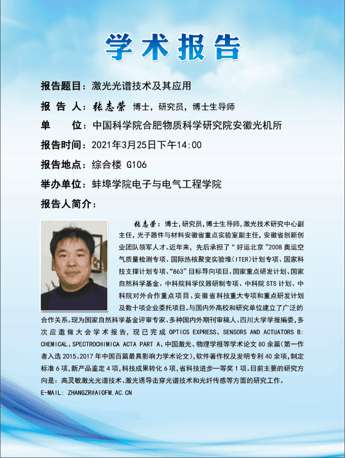 讲座时间:2019年12月18日上午8:30讲座地点:pg娱乐电子游戏官网入口第二会议室讲座人:吴先良安徽大学博士生导师,教授。安徽省首批学术和技术带头人,享受国务院特殊津贴。中国电子学会天线分会主席、电磁散射与逆散射委员会主任委员、微波测量专业委员会副主任委员,安徽省电子学会理事长,国家级重点学科“计算机应用”模式信号处理方向学术带头人、省级重点学科“电磁场与微波技术”学术带头人。全国优秀教师,安徽省劳动模范、“五一”劳动...