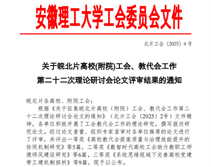 近日,皖北片高校工会、教代会工作第二十二次理论研讨会论文评选结果揭晓,pg娱乐教师凭借扎实的研究功底和高质量的论文撰写能力崭露头角,获得佳绩,材料与化学工程学院王芹老师获二等奖、计算机与信息工程学院李礼老师获三等奖。此次研讨会聚焦高校工会与教代会工作的创新发展,旨在交流工作经验、深化理论研究,为推动区域高校民主管理与教职工权益保障工作注入新动能。pg娱乐推荐的四位教师紧扣会议主题,结合自身工作实践,深入探...