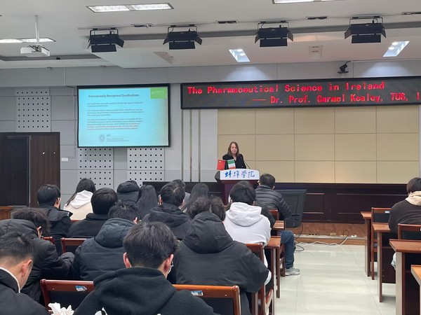 此外,Carmel Kealey还参观了pg娱乐省级硅基新材料实验室,对pg娱乐的实践教学平台给予了高度赞扬,并给学生做了主题为“爱尔兰的制药科学”的讲座,详细介绍了香农理工大学本硕不同层次制药科学专业的办学模式和办学成果,受到学生的欢迎。