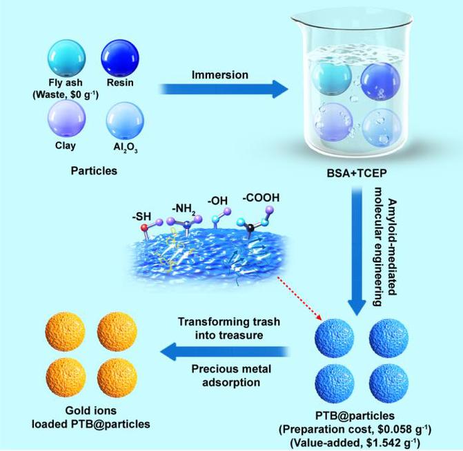 该策略采用简单环保的工艺对工业固体废物进行高价值化利用对减少环境污染,发展绿色循环经济具有重要意义。该研究工作为国际上首次报道通过淀粉样蛋白聚集介导的分子工程策略将废物颗粒转变为高价值的吸附剂,即在常温、常压、无有机试剂、水相条件下,小分子三(2-羧乙基)膦盐酸盐通过“一步法”诱导牛血清白蛋白在固体颗粒表面发生类淀粉样聚集自组装形成相转变牛血清白蛋白膜,构筑一种高吸附量的新型吸附剂,即将工业废物(以粉煤灰为模型,典型的工业固体废物)转化为高价值的吸附剂,实际应用于电子垃圾和低品位金矿石中贵金属的高效分离回收,实现废物颗粒“变废为宝”。此外,该方法可扩展到其他传统的工业吸附剂,如树脂、粘土和氧化铝等等。相比于常见的聚多巴胺和单宁酸体系所构筑的涂层相比,类淀粉样蛋白质聚集自组装纳米涂层改性材料表现出优异的无色、均匀性和稳定性等优势。