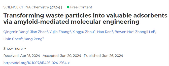 近日,材料与化学工程学院杨庆敏博士在将淀粉样蛋白聚集介导的微纳米颗粒表面分子工程策略,应用于电子垃圾和低品位金矿石中贵金属分离方面取得重要进展,相关研究成果以“Transforming waste particles into valuable adsorbents via amyloid-mediated molecular engineering”为题发表在中科院一区国际高水平SCI期刊SCIENCE CHINA Chemistry(2024 IF 10.4)上。