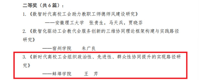 近日,皖北片高校工会、教代会工作第二十二次理论研讨会论文评选结果揭晓,pg娱乐教师凭借扎实的研究功底和高质量的论文撰写能力崭露头角,获得佳绩,材料与化学工程学院王芹老师获二等奖、计算机与信息工程学院李礼老师获三等奖。