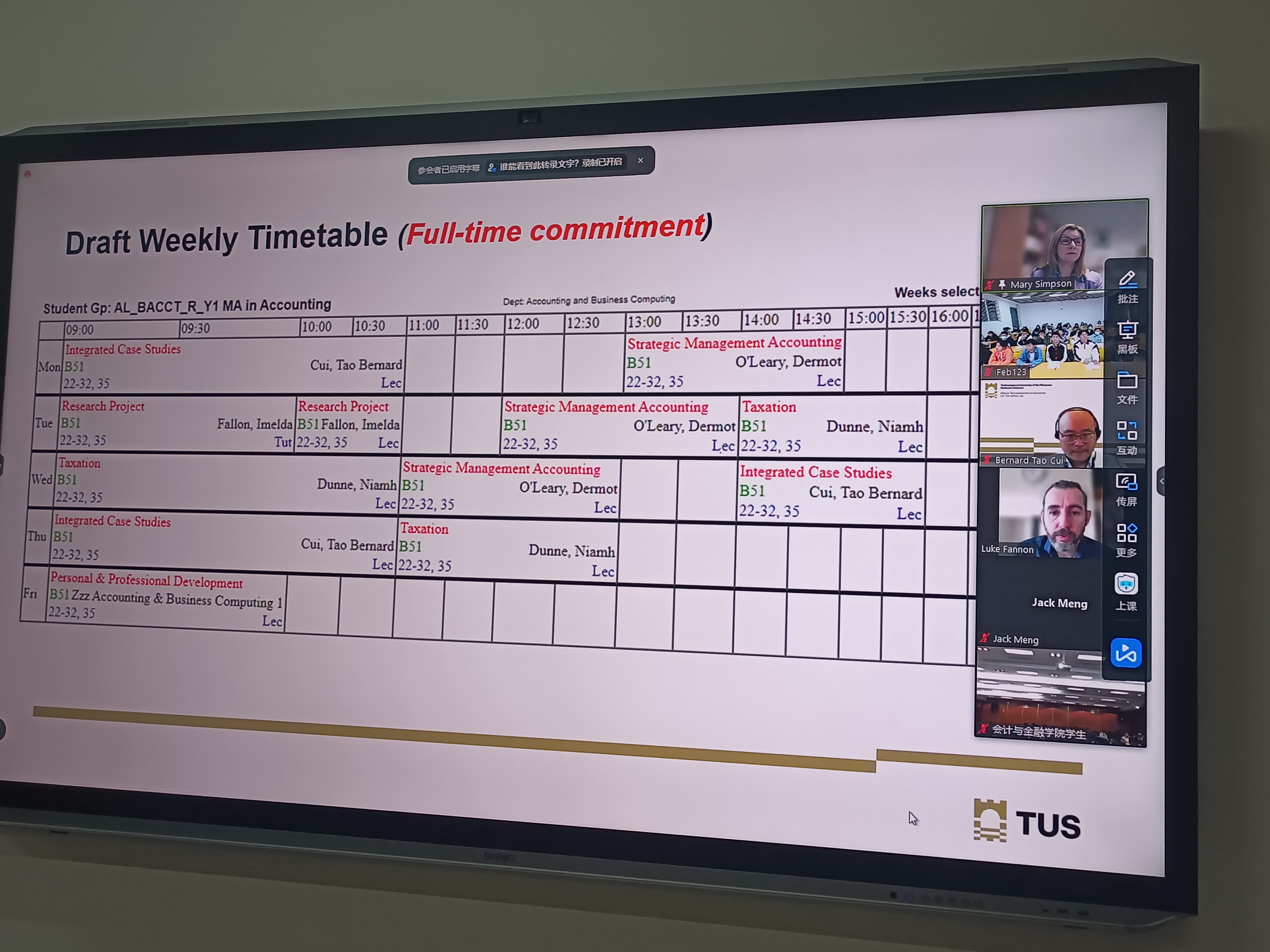 3月14日下午5:30,pg娱乐与爱尔兰香农理工大学(Technological University of the Shannon,TUS)在教学楼B118教室开展线上交流。交流会上,香农理工大学会计系主任Burnard Cui教授、硕士课程负责人 Luke Fannon教授分别介绍了该校会计学专业的本科阶段和硕士阶段的课程设置、人才培养以及毕业前景。国际交流处负责人Mary Simpson表达了与pg娱乐开展深度合作的强烈愿望。pg娱乐经济与管理学院和部分其他学院的师生参加了此次交流活动。...