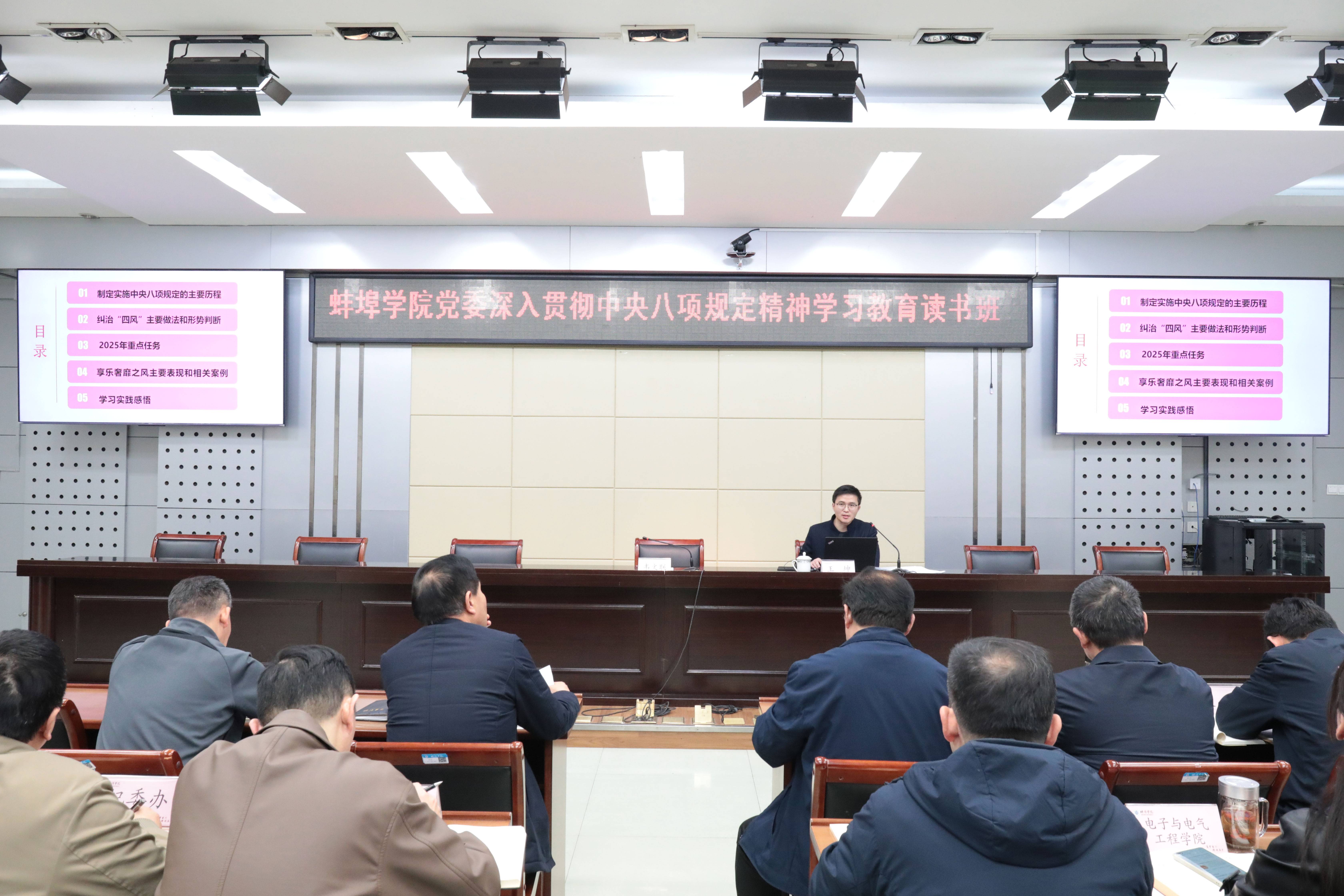 3月31日下午,蚌埠市纪委监委第一纪检监察室副主任王坤为读书班作《贯彻中央八项规定精神》辅导报告。他围绕制定实施中央八项规定的主要历程、纠治“四风”主要做法和形势判断、享乐奢靡之风主要表现和相关案例等方面进行解读,并结合工作实际提出意见建议,对学校党员干部全面准确领会中央八项规定及其实施细则精神具有很强的针对性和指导性。
