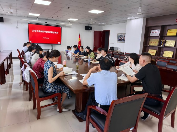 2025年6月4日下午,文学与教育学院在学院会议室开展师德警示教育,学院全体教职工参加,会议由学院党委副书记余建杰主持。