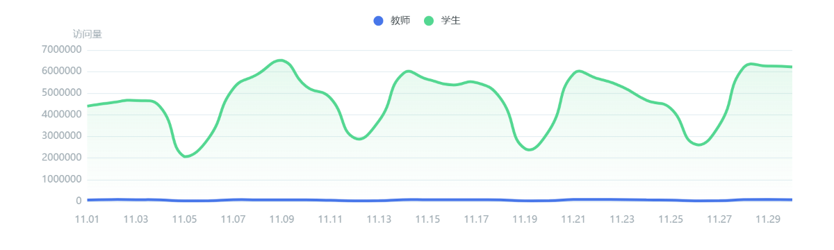 超星教学平台运行课程2080门,资源上传7484个,运行班次3593个,课堂活动351300人次。11月28日本月度达最高教师访问量(PV) :87871,发布活动9236个,发起讨论2796个,发布作业1656个,批阅作业21276人/次。11月19日本月度达最高学生访问量 (PV) :6524644, 完成任务点2172628人/次,参与活动393727人次,学生讨论144708人次,完成作业100060人/次。