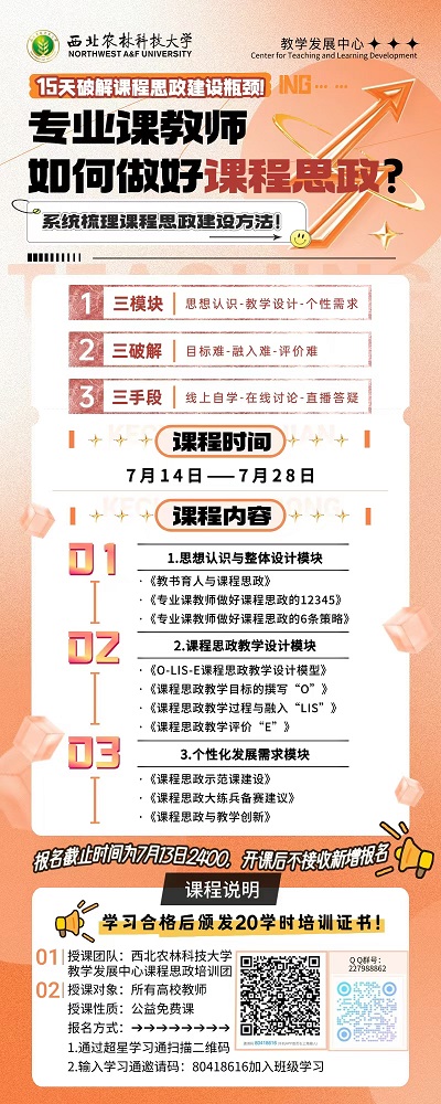 为进一步提升pg娱乐教师队伍的教学水平与育人能力,促进教师专业发展,加强校际间的交流与合作,学校决定依托西北农林科技大学教师发展中心的优秀教发团队与丰富的课程资源,开展暑期教师培训活动。现将有关事项通知如下: