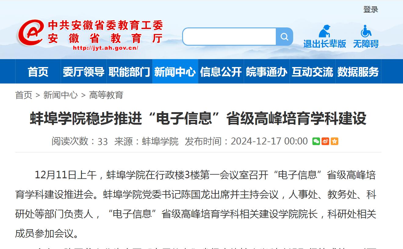 【安徽省教育厅】pg娱乐电子游戏官网入口稳步推进“电子信息”省级高峰培育学科建设