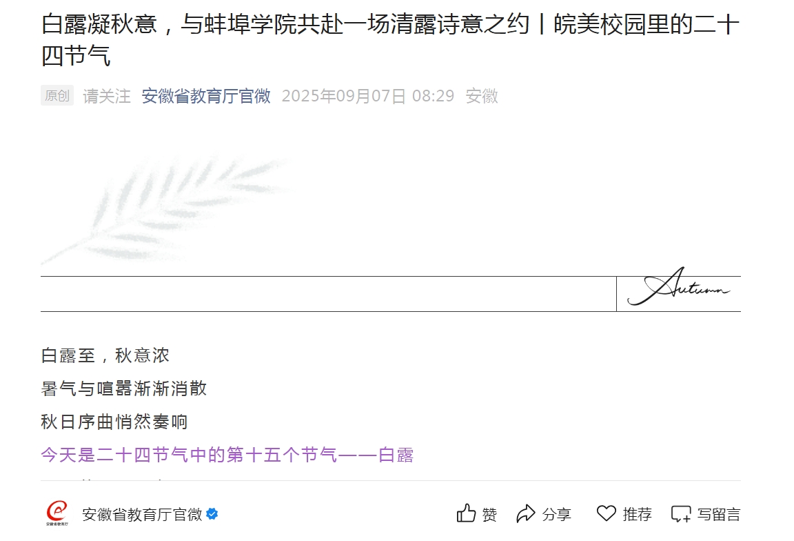 【安徽省教育厅官微】白露凝秋意,与pg娱乐电子游戏官网入口共赴一场清露诗意之约丨皖美校园里的二十四节气