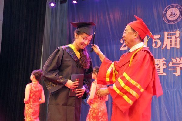 希望同学们做一个敬德修身、知行合一的人,做一个勤于学习的人,做一个传播正能量的人,做一个有梦想的人,做一个会工作和生活的人……带着对毕业生的祝福和期许,焦奎校长身着红黄两色校长服,将每一位毕业生学士帽的流苏从右边拨向左边,为毕业生一一颁发学位证书,握手祝福、合影留念,用影像定格这美好的瞬间。456名毕业生获得学士学位,刘曼等48名2015届本科毕业生被授予“山东省优秀毕业生”荣誉称号。曹绪祥等35名考研优秀学生被授予“学习标兵”荣誉称号并予以奖励,他们分别被哈尔滨工程大学、大连海事大学等高校录取为研究生。