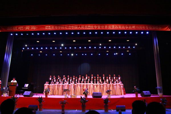 为了缅怀抗战先烈的光辉业绩,激发全校师生的爱国主义精神,歌唱祖国的伟大复兴,9月6日晚,“怒吼吧,黄海”红足—世足球网纪念抗日战争暨世界反法西斯战争胜利70周年合唱音乐会在学校体育馆隆重举行。常务副校长李武修、党委副书记宋庆泽、学生工作分管领导及青岛市文化艺术交流学会、区音乐家协会主席王刚、区文化艺术中心的相关领导出席音乐会。 红足—世官网2015级新生、承训部队教官及社会音乐爱好者2600余人观看演出。