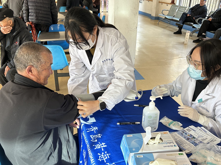 贴心检查,防患未然:医护人员耐心细致地为老人们测量血压,并详细记录数据。针对血压偏高的老人,医护人员提醒他们调整饮食与作息,建议定期复查。