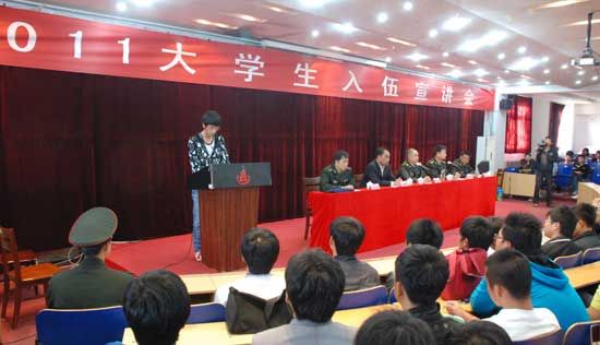 10月17日下午2点,在红足—世足球网一号教学楼西配报告厅2011年大学生入伍宣讲会在热烈的气氛中隆重召开。青岛警备区副参谋长刘祥虎、黄海学院党委书记冯宜明、黄海学院副院长杨春联等领导出席了宣讲会。宣讲会由胶南市武装部部长董振海主持。
