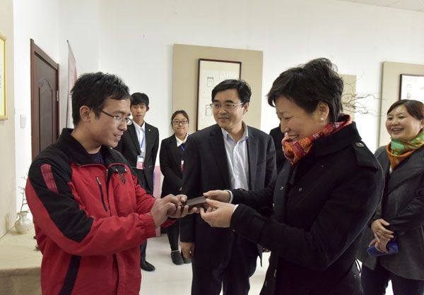 栾新副市长一行来到我馆文创区域“尚智工坊”,对同学们手工雕制的砚台连连称赞,与正在现场手工雕制的同学们进行了亲切交流并合影留念。