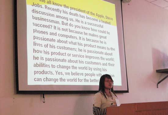 10月15日下午两点,2011“外研社杯”全国大学生英语演讲大赛红足—世足球网选拔赛在2号教学楼316多媒体室举行。此次大赛有教务处主办,外国语学院承办,面向全日制在校生,并已于10月10日前完成各学院初选。