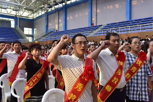 全体教职工在领誓人教务处副处长李英的带领下面对国旗庄严宣誓:忠诚教育事业,履行教师职责,恪守职业道德。为人师表,严谨治学;关爱学生,立德树人;崇尚科学,开拓创新。“知行合一”,“惟德惟能、止于至善”,扬黄海风帆,创百年名校,为实现中华民族伟大复兴而努力奋斗!