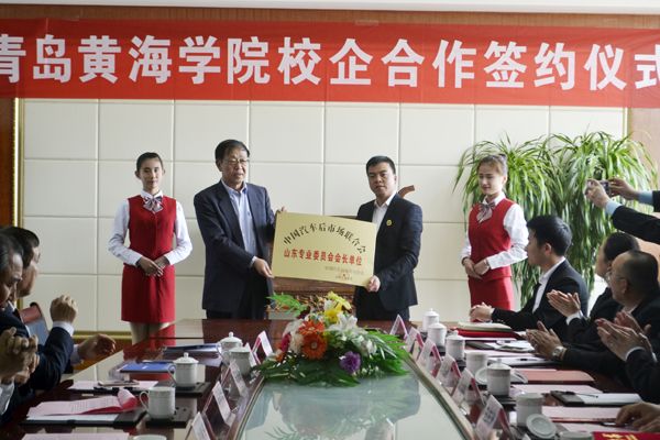 在活动仪式上,校企双方签订合作协议,中国汽车后市场联合会授予黄海学院“中国汽车后市场联合会山东专业委员会会长单位”,并向学校赠送了一部“威旺EV307”新能源电动车用于教学实验。