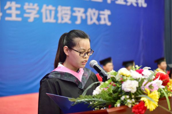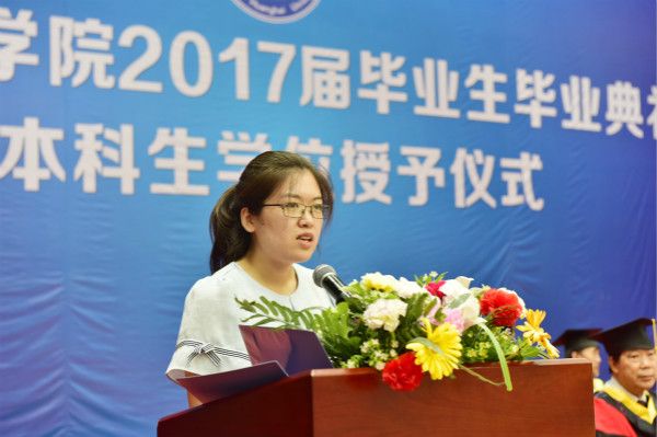 国际电子商务学院衣笑慧同学代表毕业生发言,她代表2017届全体同学感谢母校和老师的悉心教导和精心栽培。建工学院潘堃同学代表在校生发言,向即将离开母校的学长学姐们表示最衷心的祝贺和祝愿。财经学院陈丽宇老师代表毕业班教师为2017届本科毕业生送上了寄语和祝福,希望大家在走出校门继续逐梦的过程中,人生之路通达,事业之舟远航。