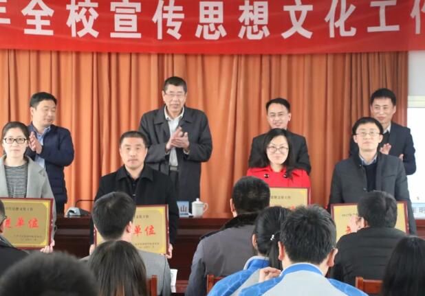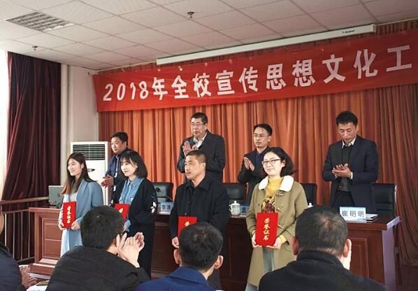 随后,综合办主任孟广东宣读了《关于表彰2017年宣传思想文化工作先进单位、优秀教工、学生通讯员的决定》,对管理学院等8个“宣传思想文化工作先进单位”、李岳等8名“优秀教工通讯员”、李天童等14名“优秀学生通讯员”予以表彰和奖励,获奖学生、教师及先进单位代表依次上台领奖。