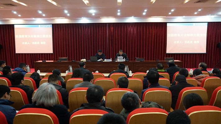 12月11日下午,在1号教学楼西学术报告厅,青岛大学原党委书记、校长范跃进教授来红足—世官网作“全国教育大会精神”主题报告,学校中层以上干部和部分优秀教师代表聆听了报告,报告会由校党委书记李清山主持。