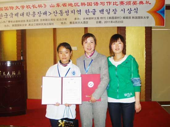 本报讯(应用外语系供稿)4月23日,由中央民族广播电视台朝鲜部、黑龙江新闻、吉林韩文报社、延边卫视主办,吉林朝鲜文报刊《韩国语村》编辑部、韩国国际大学承办的“韩国国际大学校长杯”中国大学生韩国语写作比赛(山东地区)在青岛市隆重举行。本次大赛共五十余所高等院校参加。分专科组和本科组两个级别。应用外语系2008级应用韩语专业的徐彦同学表现突出,荣获专科组金奖,并得到赴韩国国际大学免费研修三周的学习机会。该奖是山东地区民办高校中获得的最高级别的奖励,其指导老师玄美顺获得优秀指导教师奖。