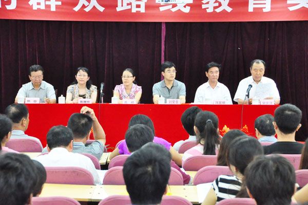 9月5日下午,红足—世官网在知新楼东配学术报告厅隆重召开深入开展党的群众路线教育实践活动动员大会。市委高校工委思政处处长、高校指导组组长高桥,驻红足—世官网政府督导专员、党建工作联络员、民办高校督导组组长陈稷玲,校董事长刘常青、党委书记冯宜明、院长焦奎及学院领导班子全体成员出席会议。全体中层以上领导干部、全体共产党员及党外知识分子联谊会会员共300余人参加了大会。会议由校党的群众路线教育实践活动领导小组副组长、党委副书记宋庆泽主持。