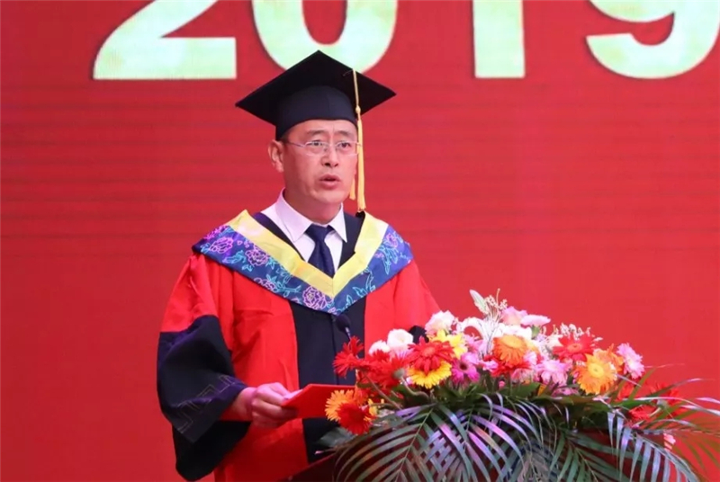 王渊明校长在毕业典礼上致辞。他代表学校向毕业生们表示热烈的祝贺!向所有为同学们的成长付出辛劳的师长、亲人和朋友们表示衷心的感谢!