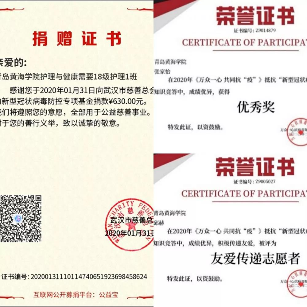 三、护理与健康学院2018级护理专科1班的同学们也纷纷献出自己的爱心,于2020年1月31日向武汉市慈善总会的新型冠状病毒防控专项基金捐款630元,并购买大量医疗物资现已捐往湖北省。虽微不足道,但也是一份充满希望的力量,当千万股力量汇聚一起,再严重的疫情也会被我们击败!