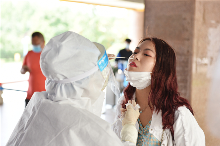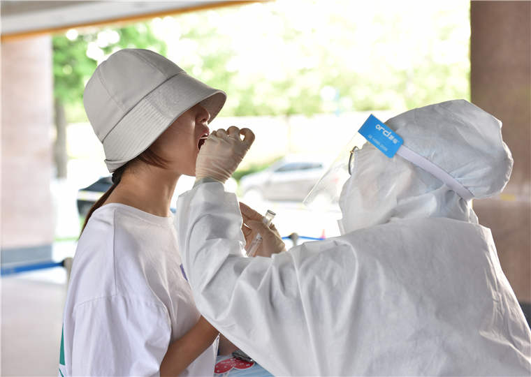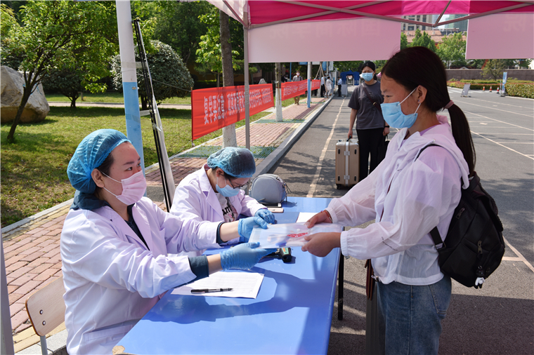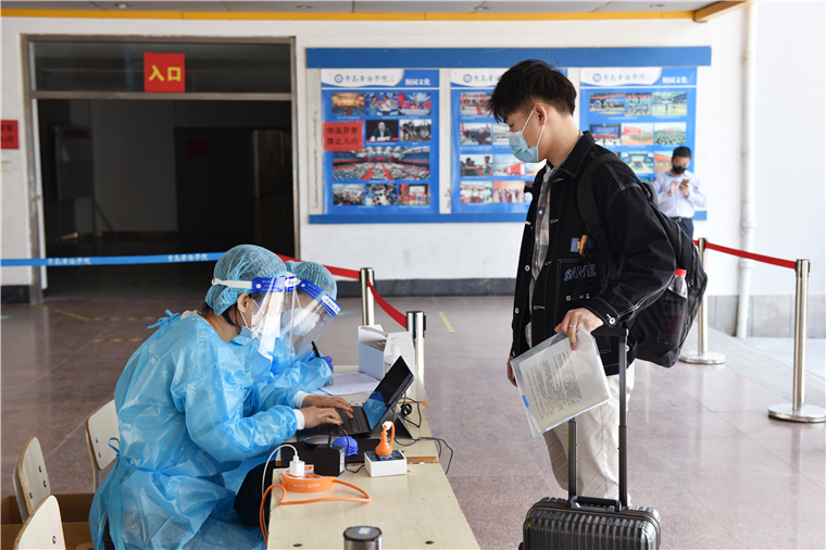 “同学们请排队等候核酸检测,注意保持距离。”伴随着工作人员的细心引导,返校学生按地标间隔排队,逐一进行鼻咽拭子核酸检测。