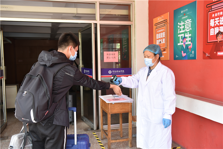学生返校前,宿舍工作人员和老师早已对宿舍进行了消毒、通风,并在宿舍楼醒目位置张贴了防疫提示,提醒大家时刻做好防护。经过身份核验和体温检测,同学们终于顺利进入宿舍。