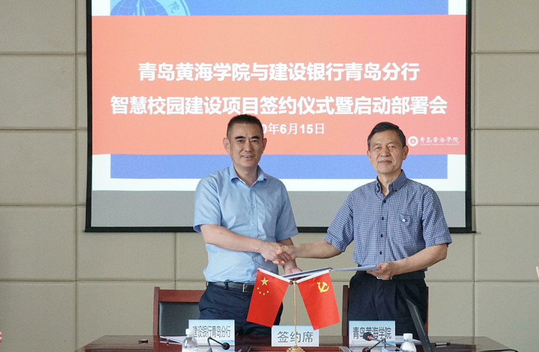 智慧校园合作协议签约仪式上。校财务部副部长陈传照向来宾介绍了学校的发展历程和基本概况。王渊明校长代表学校和建设银行青岛分行副行长徐海共同签订合作协议。