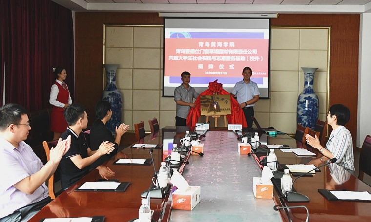 座谈结束后,双方签订战略合作框架协议,举行大学生社会实践与志愿服务基地(校外)揭牌仪式,刘纪新校长助理代表学校接受青岛爱德仕门窗幕墙型材有限责任公司的捐赠。