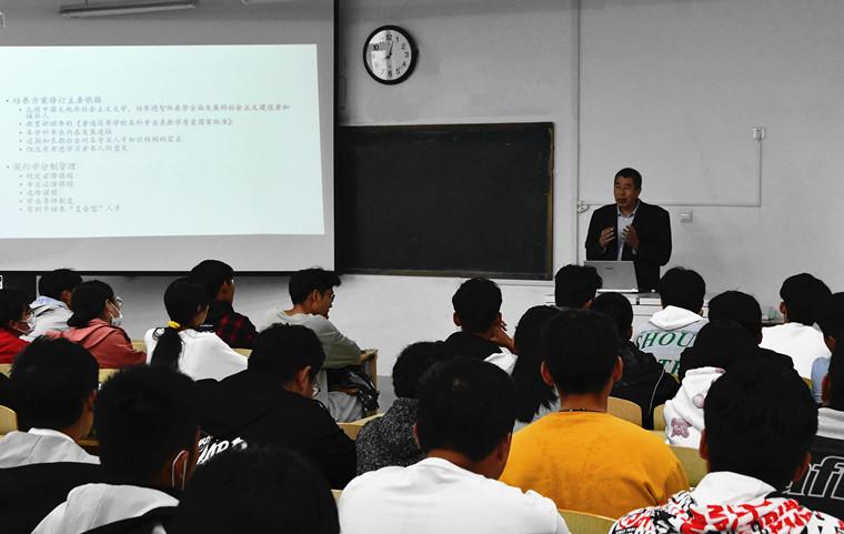 10月27日上午,在知楼二楼阶梯教室,王校长为护理学院和大数据学院2020级护理专业和计算机专业学生讲授思政课。王校长从“大学发展、大学育人、大学生活与立德修身”三个方面为新生授课。课上,王校长通过“步入大学要做什么?毕业以后想怎么发展?”两个问题启发学生思考,并与4名同学进行了问题互动。王校长指出“个人发展要与社会发展、他人幸福结合起来。思政课也是人生课,具有自主性、全面性和高阶性的特点,其根基是立德修身。”课上,王校长博古论今列举了司马光、竺可桢、蔡元培、钱学森、李四光、郎平等人的事例,讲述了“德、智、体、美、劳”的内涵及关系、“五育”的重要性,告诫同学们要珍惜大学生活,做好四年规划,全面学习发展,从教育学的角度阐述要做到“四个to”即“to be”“to learn”“to do”“to work together” ,又从心理学角度指出“青春期是成长期,是人格发展的重要阶段”。最后,王校长引用了《礼记·大学》中的句子结束课程,“古之欲明德于天下者,先治其国;欲治其国者,先齐其家;欲齐其家者,先修其身;欲修其身者,先正其心;欲正其心者,先诚其意;欲诚其意者,先致其知,致知在格物。物格而后知至,知至而后意诚,意诚而后心正,心正而后身修,身修而后家齐,家齐而后国治,国治而后天下平。”