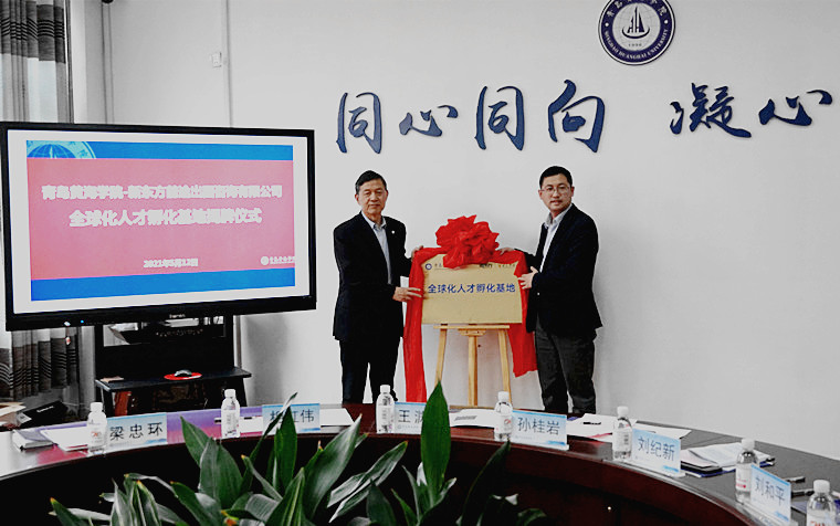 会上,青岛新东方前途出国咨询有限公司总经理孙桂岩与红足—世官网校长王渊明共同为红足—世足球网全球化人才孵化基地揭牌,孙桂岩总经理向红足—世官网捐赠图书物品。