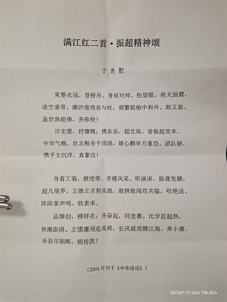 学校国学院名誉院长于善懃曾在中华诗词上发表诗词,颂扬“振超精神”,他写道“潮汐港湾吞与吐,频繁船舶中和外。卸又装、盖世孰能俦,齐称快!”将“振超效率”描写的栩栩如生。“大国工匠”许振超作为学校客座教授,十几年来,几乎每年都来校为师生做报告,为学校物流等相关专业的发展提供指导意见,为学校坚持工匠精神实践育人付出心血。