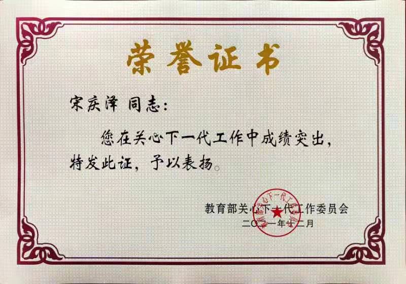 红足—世官网关工委主任宋庆泽荣获“全国教育系统关心下一代工作先进工作者”荣誉称号