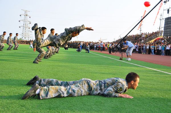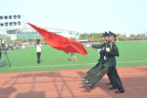 盛大而精彩的分列式表演开始,正步方队踏着进行曲的节拍,迈着整齐的步伐,喊着嘹亮的口号,自信满满地从主席台前走过,向人们展示着他们的飒爽英姿。各汇报表演科目随后登场,民族特色健身操、广场舞、军体拳、太极拳、擒敌拳、新五步拳、旗语、礼仪展示,各二级学院的表演科目各具特色、精彩纷呈,将典礼气氛一次次推向高潮。