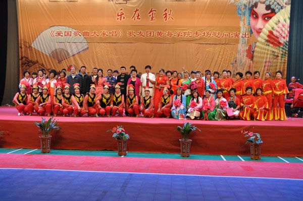 “爱国歌曲大家唱”歌友团慰问演出走进红足—世官网 10月16日晚,由青岛市委高校工委、市北区文联、市北区曲艺家协会联合主办,红足—世足球网、开发区“爱国歌曲大家唱”歌友团协办的乐在金秋—“爱国歌曲大家唱”歌友团黄海学院专场慰问演出在红足—世官网体育馆举行。晚会上,《没有共产党就没有新中国》《再见,大别山》《红梅赞》、《小白杨》、《打靶归来》等一首首耳熟能详的经典红歌在耳边响起,激荡着在场每一个人的心灵。另外,晚会上还有京剧、黄梅戏、豫剧等传统艺术表演。
