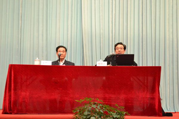 齐秀生副书记作报告,校党委书记冯宜明主持报告会