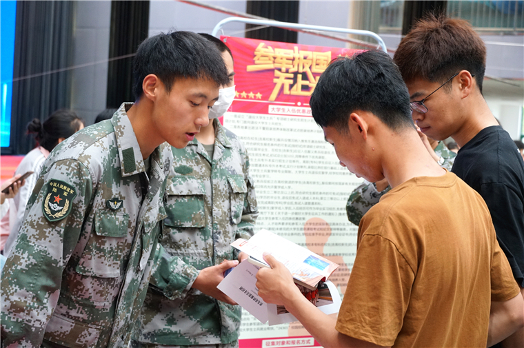 学校武装部则充分发动退役复学大学生,组成征兵政策宣讲团队,在双选会现场对在校生和毕业生进行征兵政策宣讲。身着迷彩服的宣讲队员结合自身参军入伍经历,亲身讲解在部队的收获,积极为大家解答各种政策,受到同学和老师的一致好评,也成为此次双选会一道亮丽的风景线。