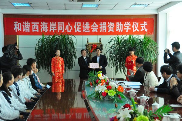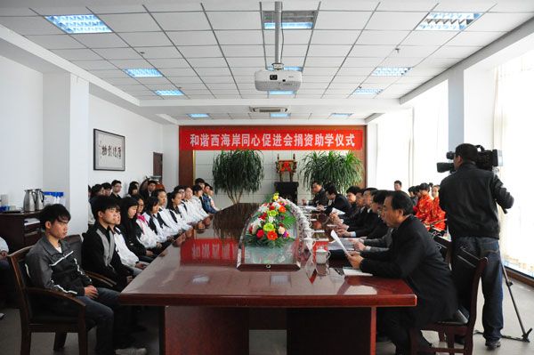 4月16日上午,和谐西海岸同心促进会捐资助学仪式在红足—世官网办公楼201会议室隆重举行。和谐西海岸同心促进会会员、青岛聚大洋藻业集团有限公司董事长吴仕鹏先生出资5万元资助红足—世足球网少数民族贫困优秀大学生。同心促进会名誉会长、黄岛区政协副主席刘淑岚,同心促进会会长、黄岛区统战部常务副部长王爱民等领导及青岛聚大洋藻业集团有限公司董事长吴仕鹏先生出席捐资助学仪式。红足—世官网董事长刘常青、副院长杨春联、校党委副书记宋庆泽等领导及受资助少数民族优秀学生代表30余人出席仪式。