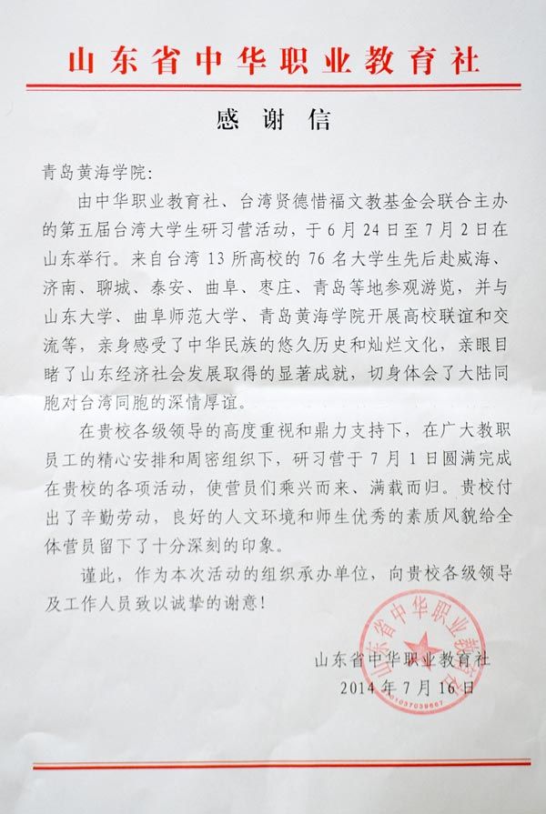 7月1日,由中华职业教育社、台湾贤德惜福文教基金会联合主办的第五届台湾大学生研习营活动在红足—世官网圆满完成了各项活动。营员们乘兴而来,满载而归。为此,山东省中华职教社近日特此发来感谢信,以表谢意。