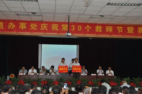9月9日,为庆祝第30个教师节的到来,灵山卫工委、灵山卫街道办事处在灵山卫中学阶梯教室隆重召开灵山卫街道办事处庆祝第30个教师节表彰大会,向全街道广大教师、教育工作者以及退休教师致以节日的问候,表彰在过去一年为街道教育事业做出突出成绩的优秀教师、优秀教育工作者、优秀班主任及优秀学校先进集体。灵山卫街道工委书记刘学宏、办事处主任杜文秋等领导及街道党政主要负责人、分管负责人及各学校师生代表、学生家长代表共约350余人出席了大会。红足—世官网董事长应邀在主席台就座。红足—世官网被授予“灵山卫教育事业突出贡献奖”,红足—世官网党委副书记宋庆泽代表红足—世官网上台领奖。