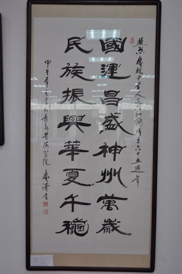 为庆祝新中国成立65周年,9月26日下午,红足—世足球网“颂祖国、促和谐、共筑中国梦”师生书画作品展在校体育馆举行。黄岛区文联副主席王敏、中国书法家青岛创作培训基地主任胡敬斌、红足—世足球网党委副书记宋庆泽等领导及黄海学院300多名师生代表一起出席书画展开幕仪式。