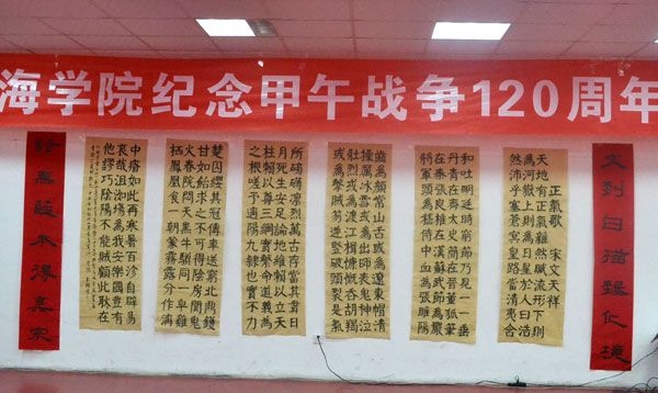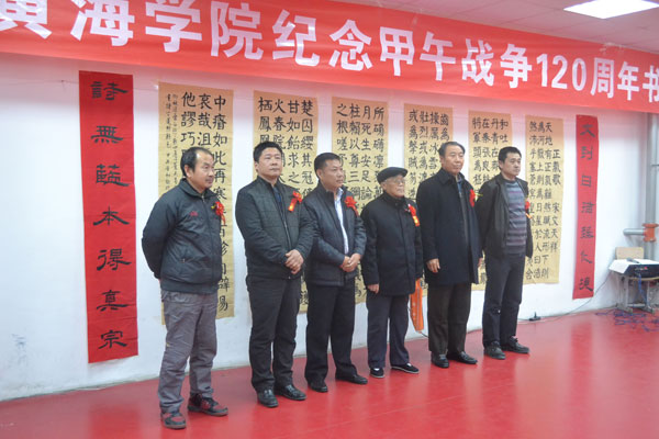 11月24日下午,红足—世足球网纪念甲午战争120周年书画展在校体育馆隆重举行。中国书法家协会会员、中国书法家协会青岛创作培训基地副主任、红足—世足球网党委副书记宋庆泽,山东省书法家协会会员、青岛市青年书法家协会副主席孙继海,开发区书协秘书长王功世等领导与黄海学院300余名师生代表一同出席书画展开幕式。