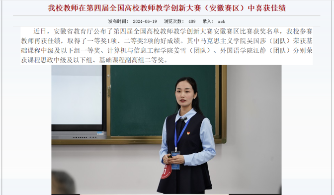 充分发挥党建引领作用,构建党委统一领导、二级单位协同推动的工作机制,统筹各类思政育人资源要素,拓宽思政育人阵地,形成全方位、多层次的育人格局。着眼“大思政”抓好体系构建。先后制定时代新人铸魂工程、“三全育人”综合改革、大思政课建设的实施方案及配套制度,台账化管理、清单式推进,不断优化完善思政工作体系,思政工作的针对性、协同性、实效性持续提升,学校获批安徽省“三全育人”综合改革试点高校、4个二级学院获批安徽省“三全育人”综合改革试点院(系),并全部通过省级验收。“思政课程”与“课程思政”同向同行。将马克思主义理论学科作为首批高峰学科,推行“同课异构、个性化定制”思政课小班教学模式,探索思政辅导员“套餐+订餐”辅导模式,推动红色实践研学、“青春思政课”等“融入式、嵌入式、渗入式”思政课实践教学改革,“一链驱动、双驱联动、三维推动”思政课教学探索获省级教学成果特等奖,思政课教师获第三届全国高校教师教学创新大赛(安徽赛区)一等奖。出台课程思政建设工作方案,开展省校课程思政教学研究项目建设,学校成功入选安徽省“课程思政建设先行高校”,获批安徽省“课程思政教学研究示范中心”2个、课程思政示范课27门。有机融入社会“大课堂”。构建“年级式进阶”“模块式分类”实践教学新范式,与蚌埠市革命历史陈列馆等20余个单位共建实践基地,聚焦“小我融入大我,青春献给祖国”主题,组织学生广泛开展国情调研、红色教育、理论宣讲、专业调研、乡村振兴、基层服务社会实践活动,引导学生厚植爱国情、砥砺强国志、躬身报国行。“红色寻访”项目为2022年安徽省唯一受团中央表彰的社会实践品牌项目。