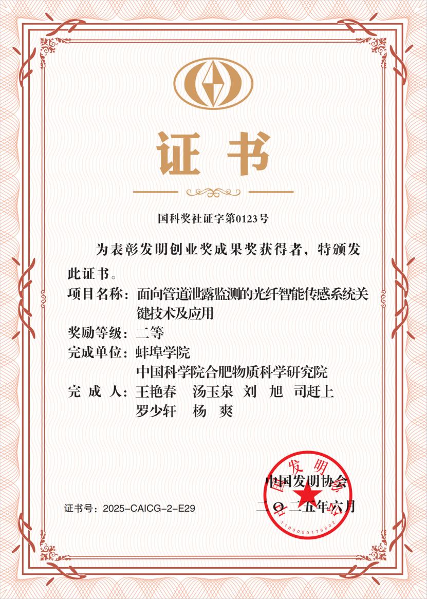 近日,中国发明协会公布了2025年度“发明创业奖”获奖名单。由pg娱乐作为第一完成单位,电子与电气工程学院王艳春教授团队牵头,联合中国科学院合肥物质科学研究院共同申报的“面向管道泄漏监测的光纤智能传感系统关键技术及应用”项目,荣获“发明创业奖成果奖二等奖”。