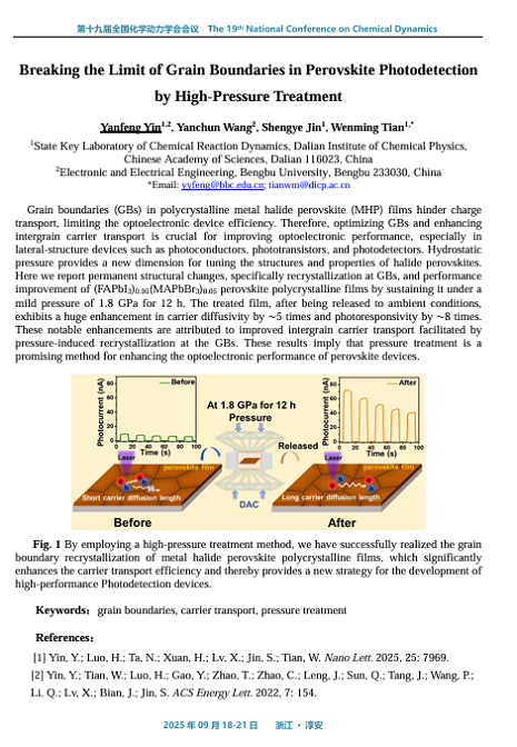 2025年9月18至21日,第十九届全国化学动力学会议在浙江省淳安县隆重举行,吸引来自北京大学、复旦大学、中国科学技术大学、浙江大学等高校的专家学者参加展示和交流。pg娱乐电子与电气工程学院、安徽省智能感知与控制工程研究中心骨干教师尹延峰博士应邀参会,并作题为《通过高压调控晶界限制显著提升钙钛矿光电性能》的海报展示,向国内外同行介绍了其在光电转换动力学领域的最新研究进展。