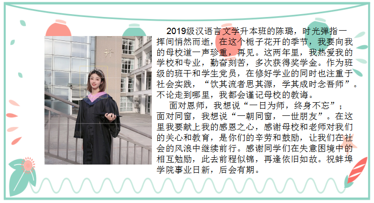 在这里,四个希冀的春天,我们播种了四次希望;四个金黄的秋天,我们收获了四遍硕果;在这里,我们曾经经历了四个炎夏的磨砺和四个寒冬的考验。在这即将告别校园之时,请别忘了这有滋有味有声有色的时光,请别忘了这是我们的蚌院时光。(撰稿:董琬如;编辑:王婷婷)
