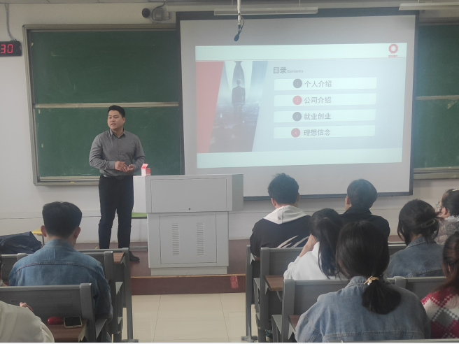 为深入贯彻落实三全育人理念,强化校地协同育人,拓展思政教育新途径,增强思想教育的针对性,发挥优秀校友示范引领作用,4月28日上午,材料与化学工程学院在G305举办校友企业家讲思政课活动,2016届优秀校友毛长军开展题为“立鸿鹄志,做奋斗者”的讲座,讲座由院党委副书记朱银邦主持,2020级部分学生参与活动。